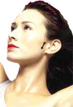 Точка №5 Уменьшает морщины, улучшает контуры глаз и бровей. Плотно прижмите электроды вертикально к верхней части скулы, прилегающей к уху. Убедитесь, что верхний контакт находится выше СЛУХОВОГО прохода. Этот метод разрабатывает мышцы вокруг глаз, производя постоянное легкое движение век, бровей и лба. ВНИМАНИЕ: Во время воздействия глаза не должны закрываться (слишком сильное воздействие), движение век, бровей и лба должно быть видимым. Чтобы распространить движение на лоб увеличьте интенсивность |
